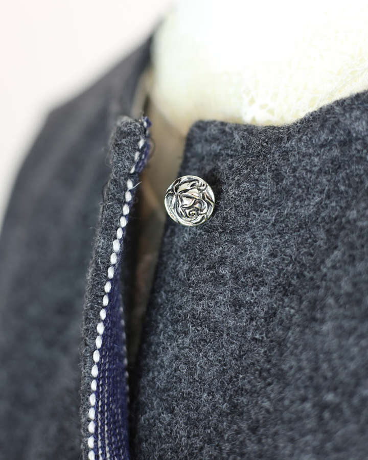 Mittelblaues Schalkragen Dirndl mit eingewebtem Jaquard und einer zimtfarbigen Paspel. Der Rock hat eine rote Erdfarbe.